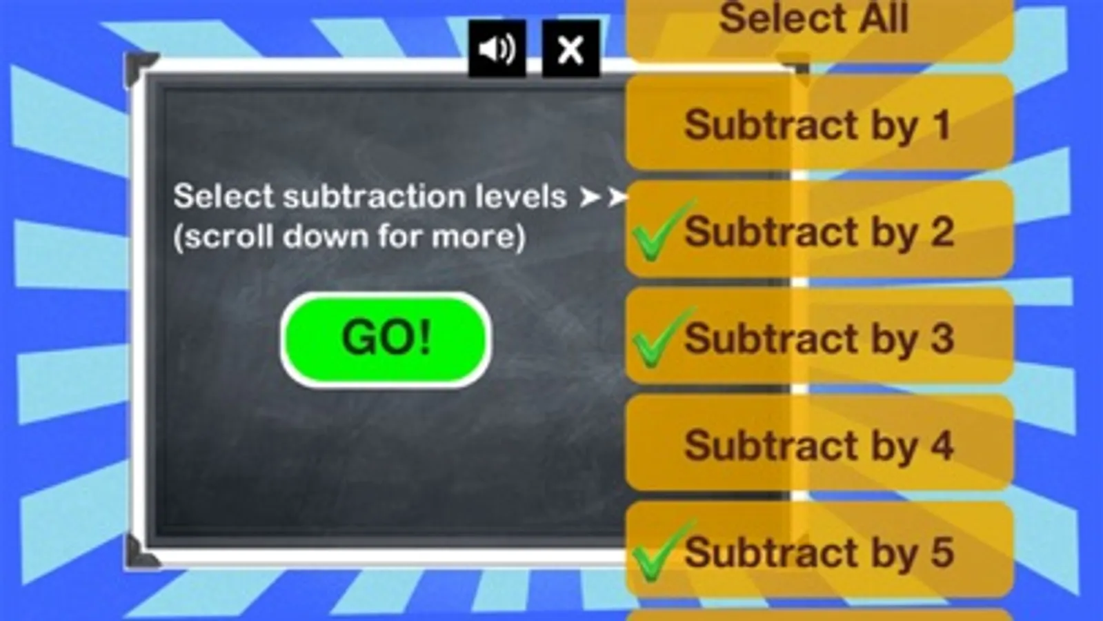 - Select one or more subtraction levels and start the game!