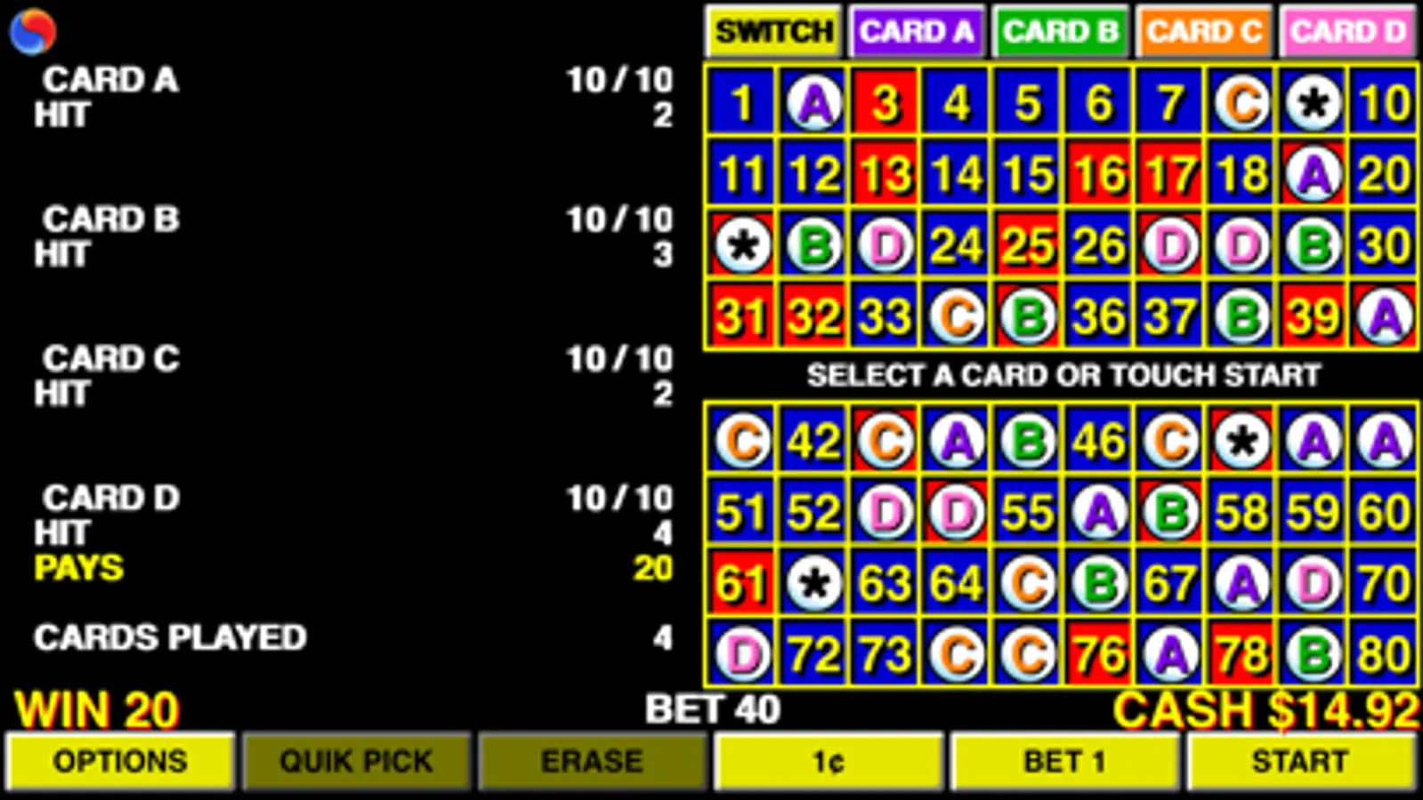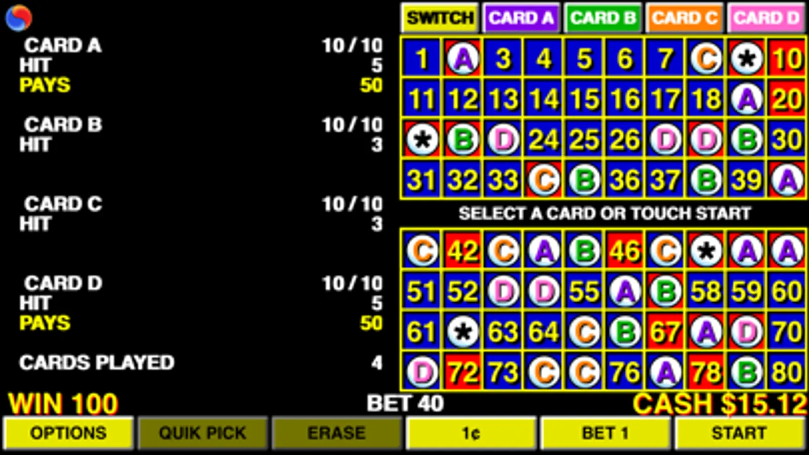 * bet from 1 to 10 on each of the 4 cards