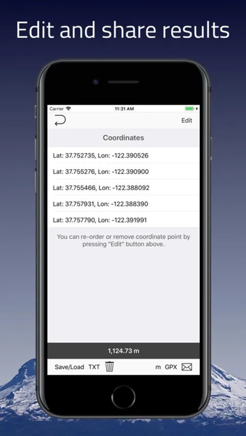 It is possible to export the list of coordinates in latitude and longitude values, plus the total distance, to email. You can also export the list as GPX file to email.