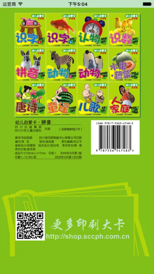 《幼儿启蒙卡》根据幼儿或汉语初学者的认知能力,按类编排,分为识字(上、下)、认物、识数、拼音、动物(上、下 )、水果蔬菜、唐诗、童谣、儿歌、人和家庭等12册。该产品贴近生活,便于家长、老师对孩子或汉语初学者进行启蒙认 知教育。