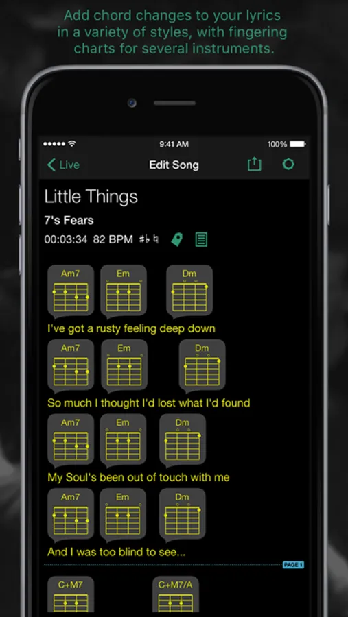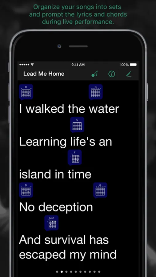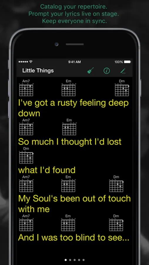 Catalog your repertoire. Prompt your lyrics live on stage. Keep everyone in sync.