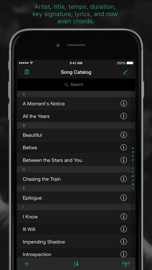Store information about every song in your catalog. Artist, title, tempo, duration, key signature, lyrics, and now even chords. Your catalog will store all the information you need to design the perfect set for tonight’s performance.
