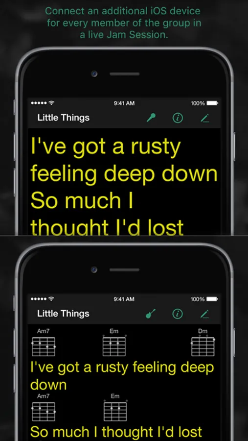 Those who perform in a group can keep everyone in sync using the Jam Session feature. Connect an additional iOS device for every member of the group, and each performer can have his or her own view of the lyrics, the upcoming songs in the set, or both.[2]