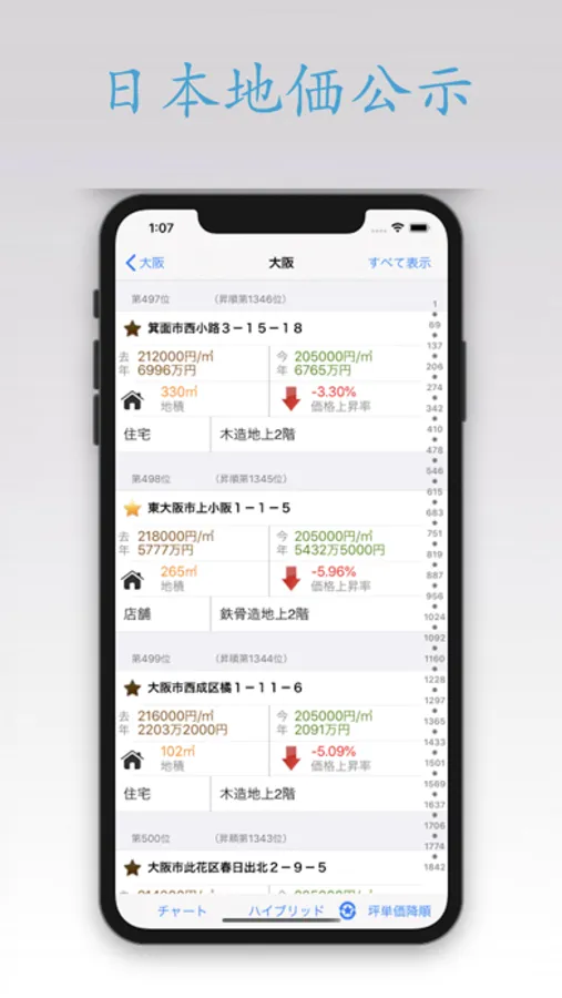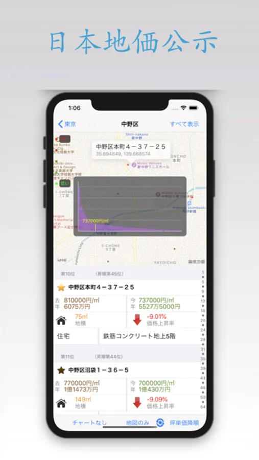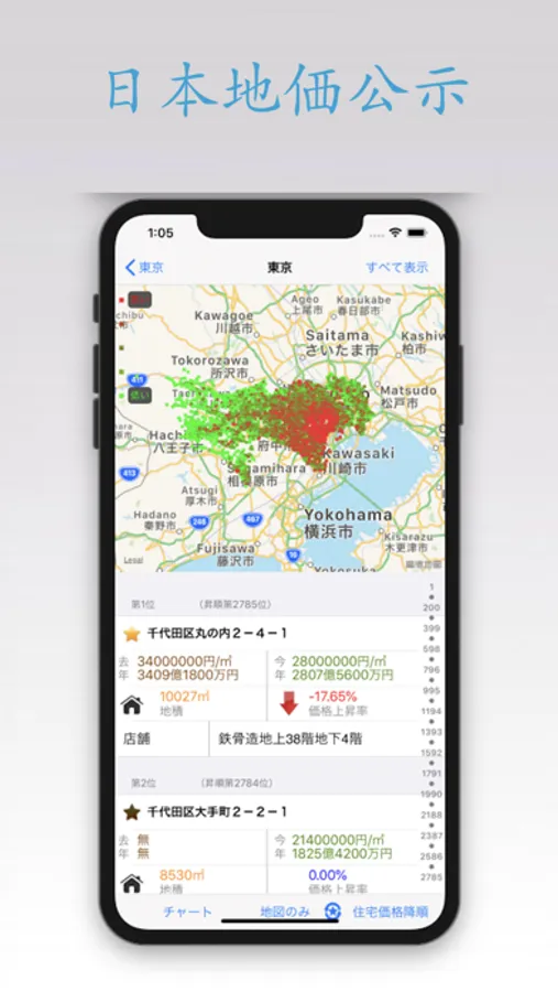 「五十音順」、「坪単価順」、「地積順」、「住宅価格順」或は「価格上昇率順」で地価をランキングして、「ラインチャート」を表示できる。