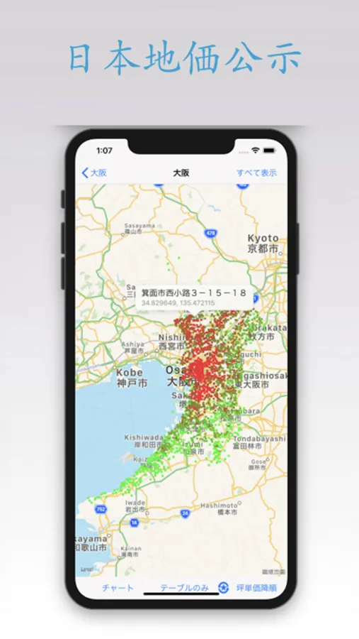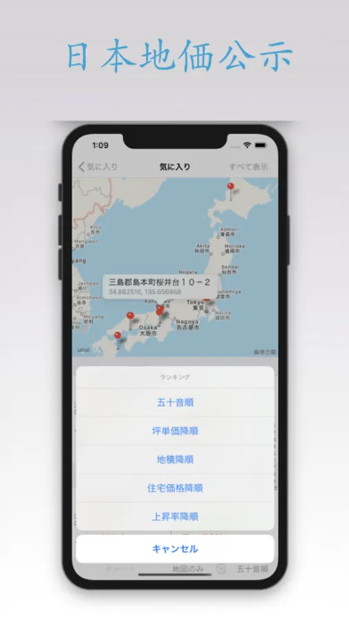 「都道府県」内のすべて或は指定した「市区町村」の地価情報を切り替え表示できる。