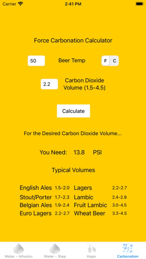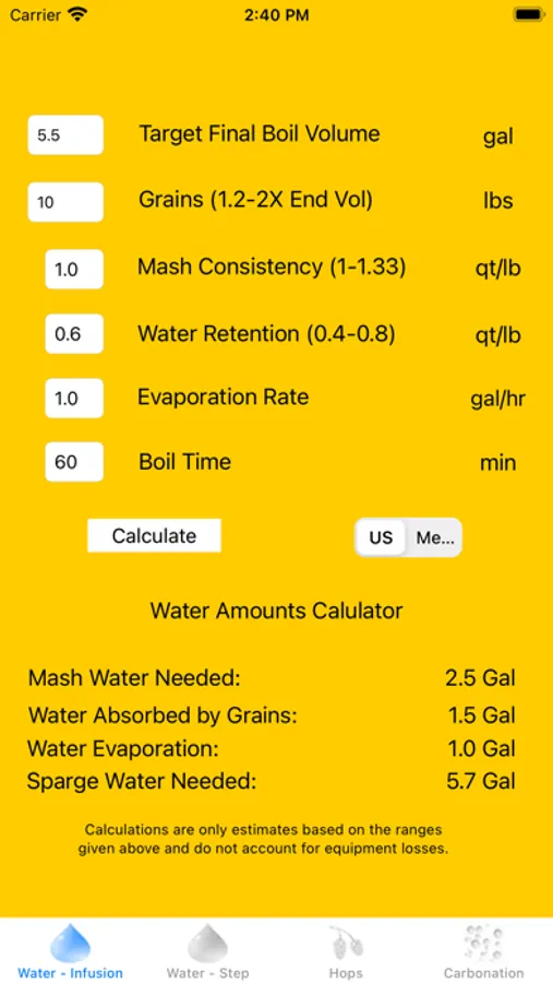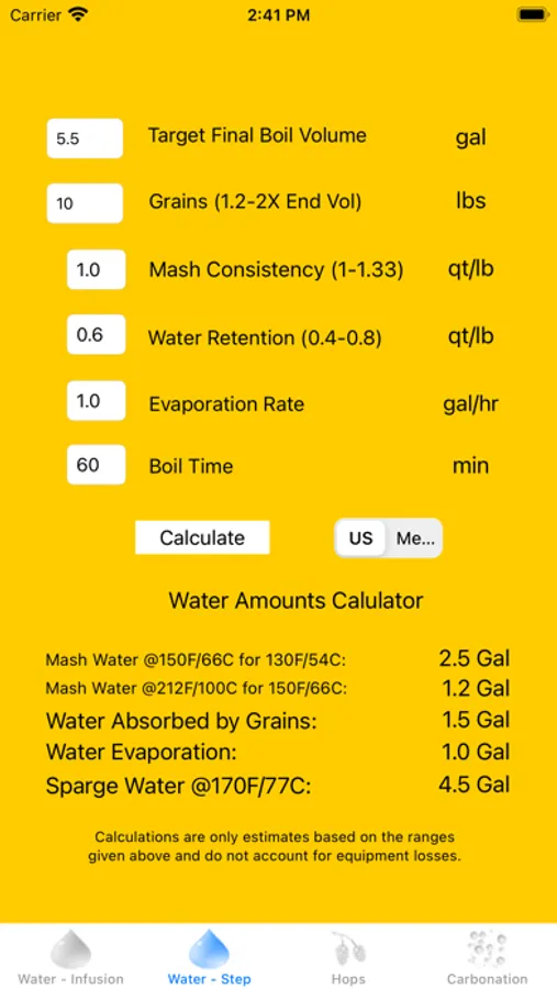 This app has four tabs for common beer brewing calculations. The first tab is a water amounts calculator that estimates mash water, water absorption, water evaporation, and sparge water for an all-grain infusion mash. The second tab is a similar water amounts calculator except that it is for an all-grain step mash. The third tab calculates International Bittering Units (IBUs) based on hop characteristics, volume of beer, boil time, and wort gravity. The fourth tab calculates carbon dioxide pressure for force carbonation of beer. Happy brewing!