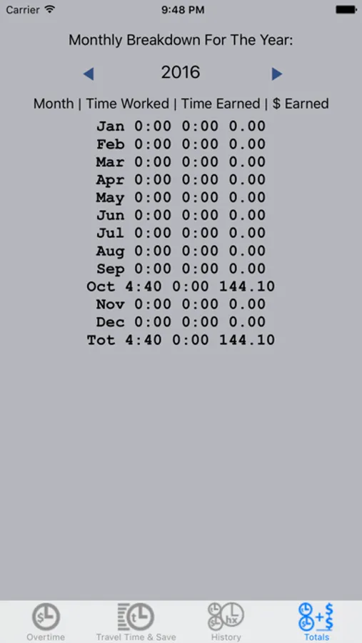 You are also provided with a monthly breakdown for the year you select. The breakdown reports how many hours you worked and, depending on the option, the summation of hours and cash.