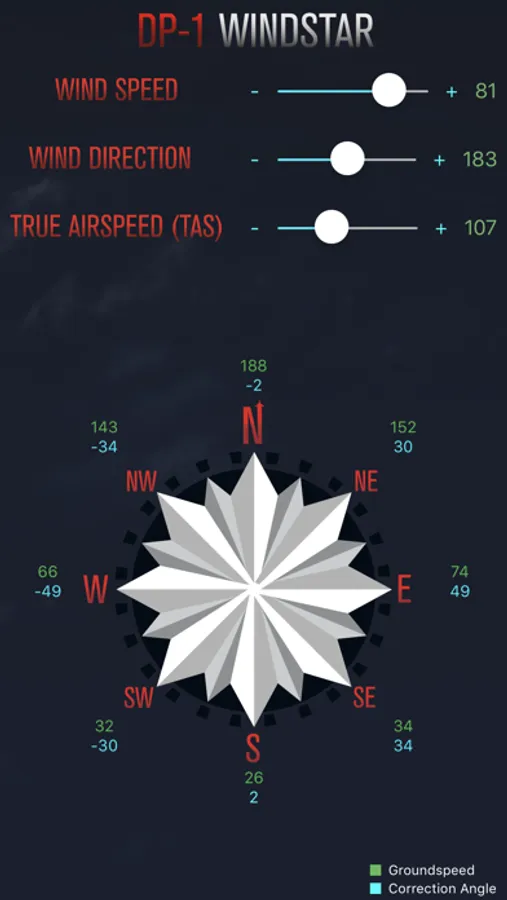 Designed to aid CPL and PPL training, Pilot Windstar aids navigation and diversion techniques. Simply select wind direction in degrees, windspeed and TAS in kts and let the app do the work for you!