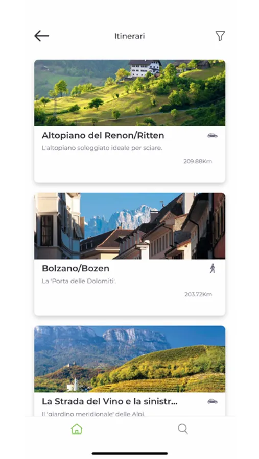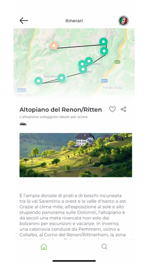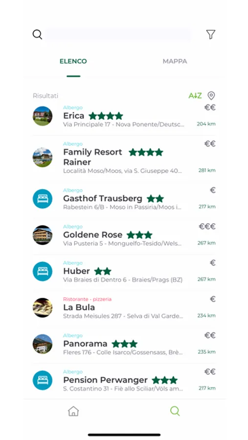 12 routes throughout the South Tyrol: forests, lakes, valleys, castles, picturesque location and beautiful landscape of the Dolomites. Each tour has photos and an important selection of points of interest geolocalized on the map Over 200 points of interest: monuments, streets, areas, gardens, churches to discover and to visit. Each with address, underground stop, description, map, opening hours, admission, available facilities Over 130 places to eat from the cheapest to the most luxury restaurant with our reviews, opening days, cuisine, price, credit cards accepted, animals allowed Over 250 places to stay: hotels, bed&breakfast, residence, campingsite, farmholidays with our reviews, rating, opening period, extimated cost, credit cards accepted, parking Over 300 recommended addresses for shopping, nightlife, wellness, sport, activities. You will find where you can have a break and try an excellent ice-cream or a coffee. You are looking for a gift? check in our list. Over 90 suggestions to know gastronomic specialities, history, Arts, books, cinema, music...)