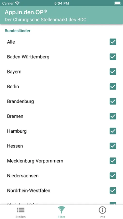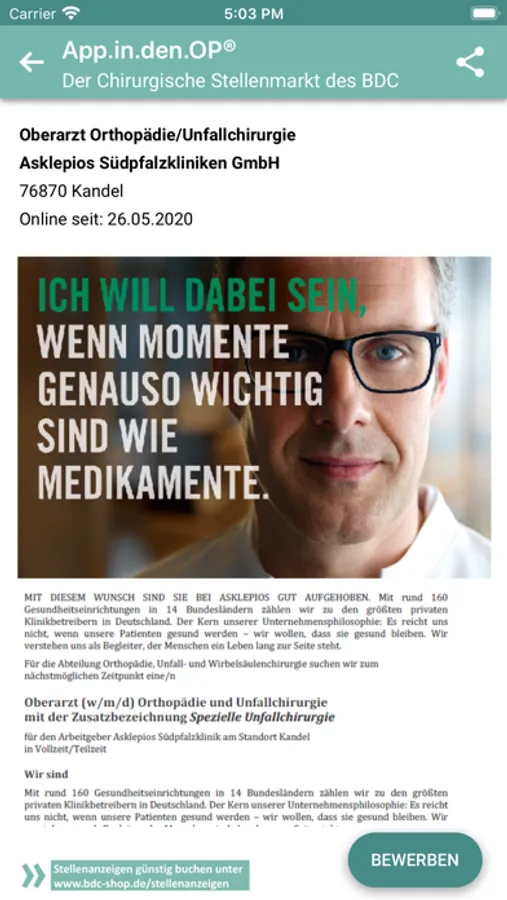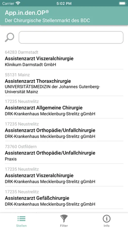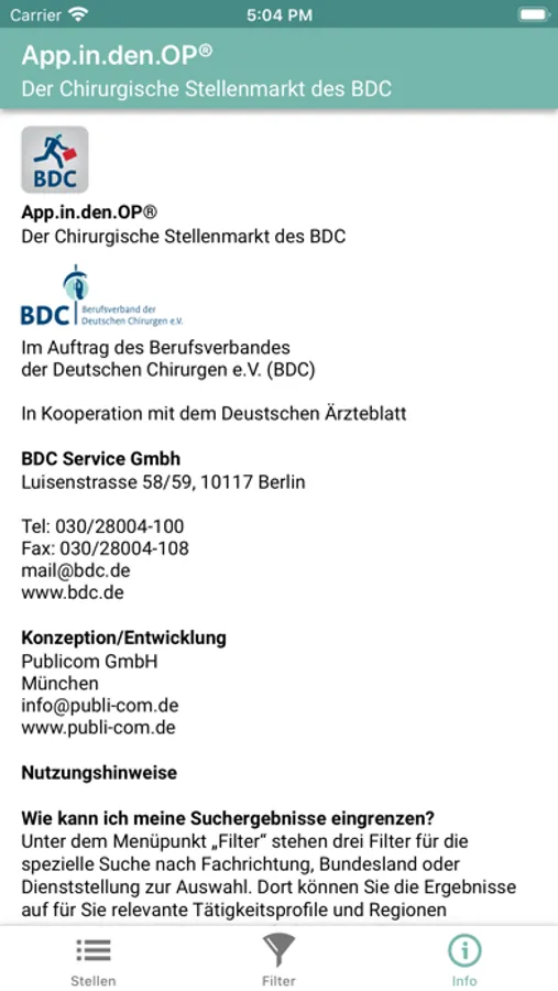 Mit App.in.den.OP® bietet der Berufsverband der Deutschen Chirurgen (BDC e.V.) in Zusammenarbeit mit dem Deutschen Ärzteblatt eine Angebotsplattform für Chirurgen, die bundesweit nach Stellenangeboten suchen und direkt mit dem Inserenten Kontakt aufnehmen können.