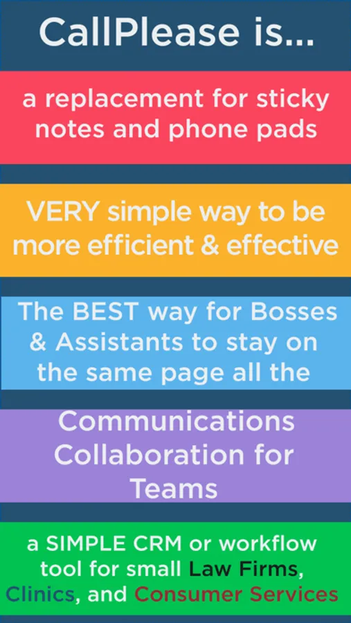 CallPlease helps you and your team be more productive anywhere you work. As a system for managing communications workflow, we have expanded on the traditional call logging system to enable instant access to one or more logs and address books and create customized workflows that help everyone know "What's Next." All information is tracked, synced and centrally managed among multiple users on all devices worldwide. CallPlease is the perfect mobile solution for anyone who wants to reduce communications chaos - individuals, executives + assistants, receptionists, teams, entire offices.