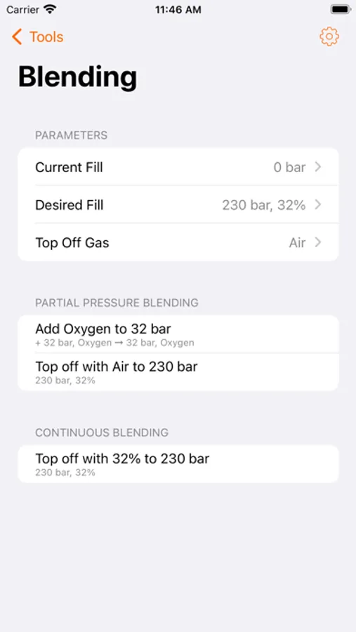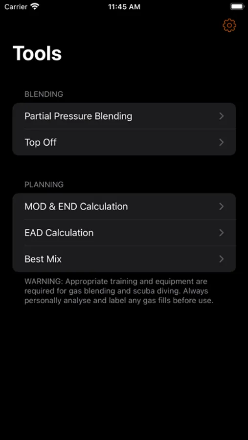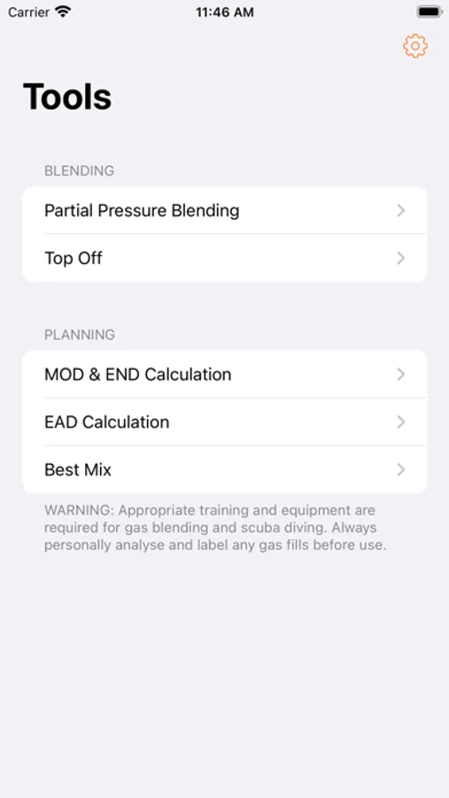 Gas Manager includes various tools for planning and blending diving gases, including nitrox and trimix partial pressure blending, top off and best mix calculators, as well as MOD, END & EAD calculation.
