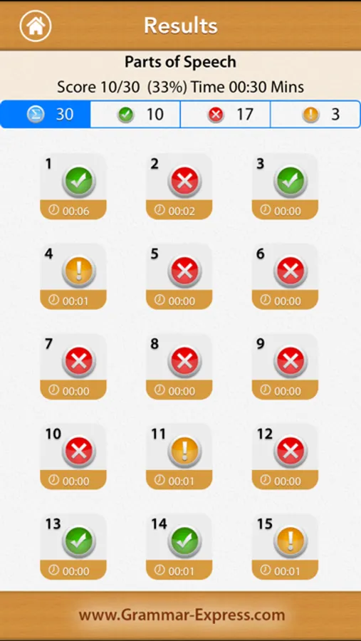 A summary of the practice test is presented at the end of each test. It shows you the score, which questions you answered correctly and where you were wrong.