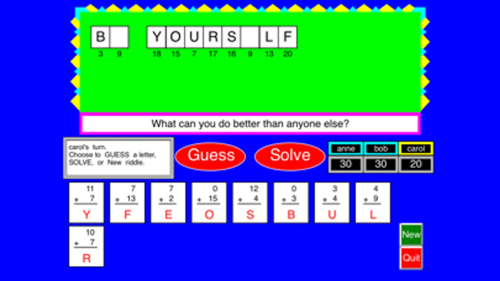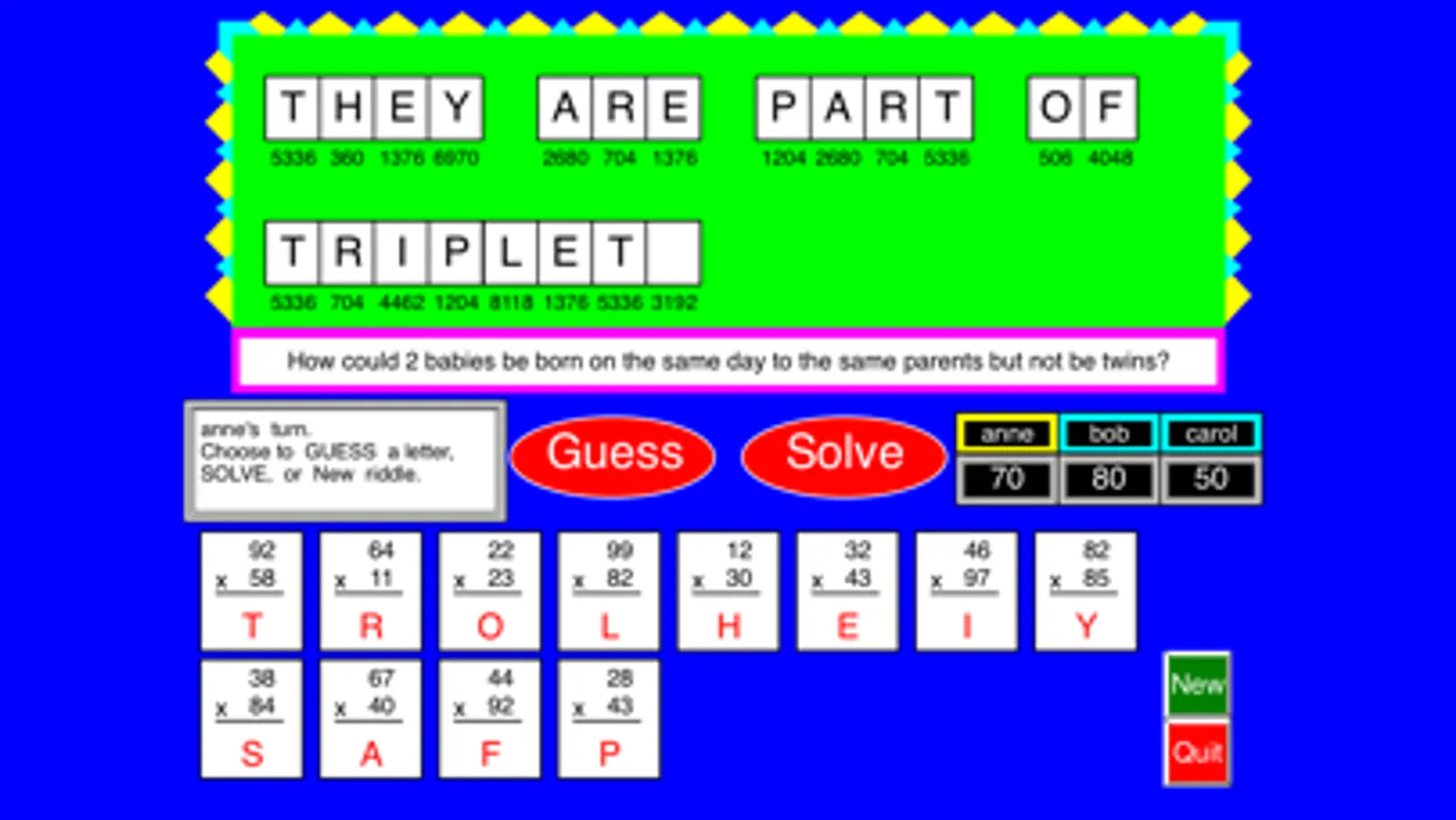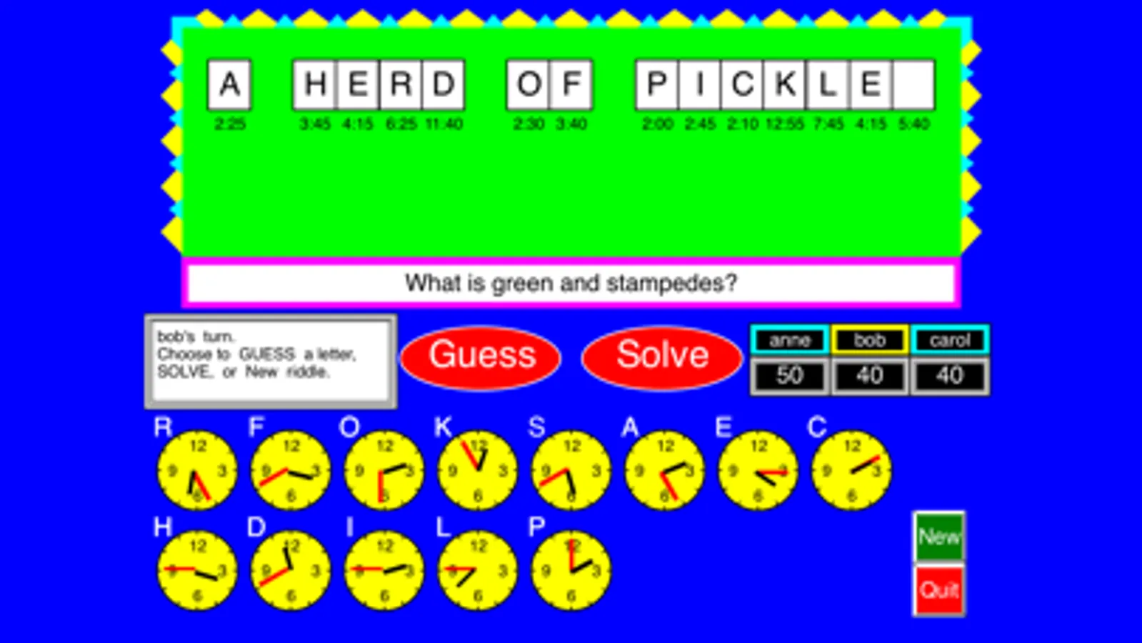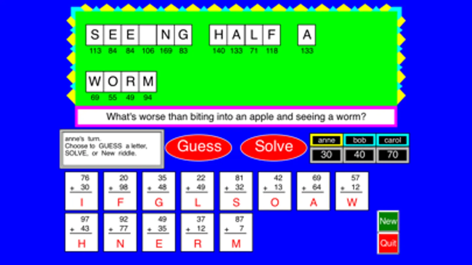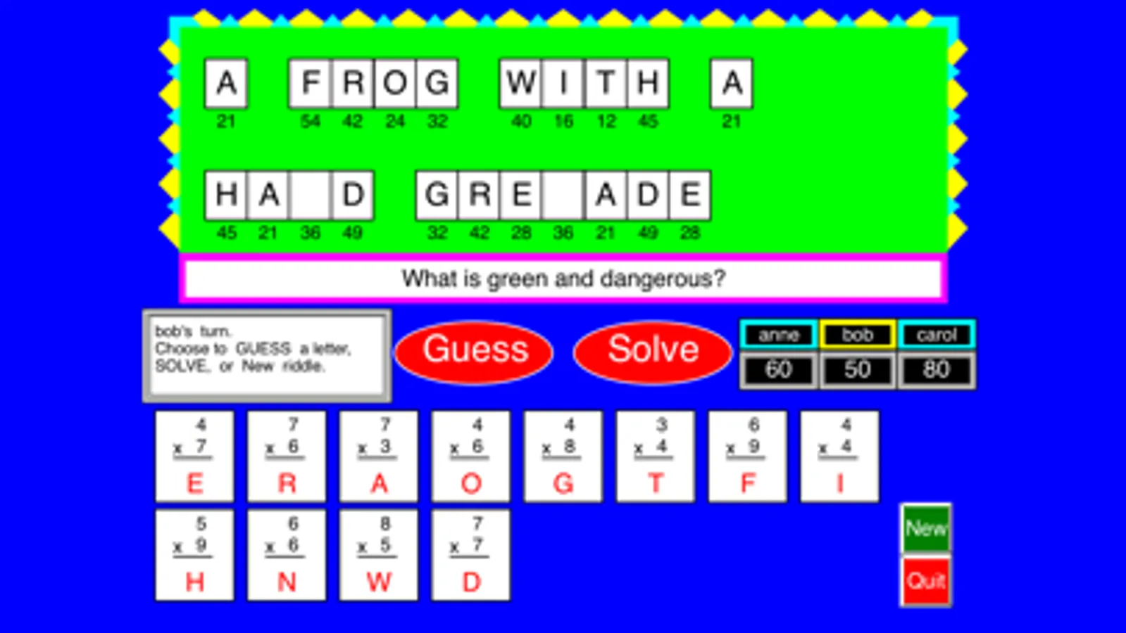 Math Galaxy Whole Number Riddles is a game like Wheel-of-Fortune, with the answers to math problems as clues to riddles and word jumbles. There are 500 riddles and 600 word jumbles with definitions which are chosen randomly. Numbers for math problems are created randomly and cover whole number operations (add, subtract, multiply, divide), time, money, and measurement (which includes adding, subtracting, multiplying and dividing length, volume/capacity, weight and time).
