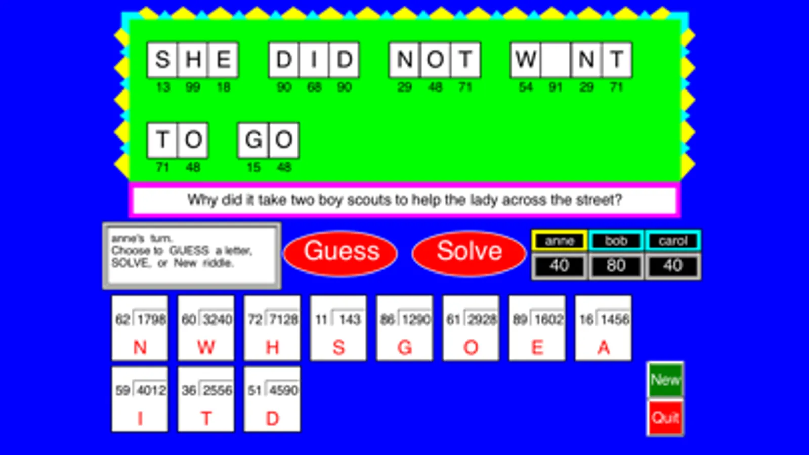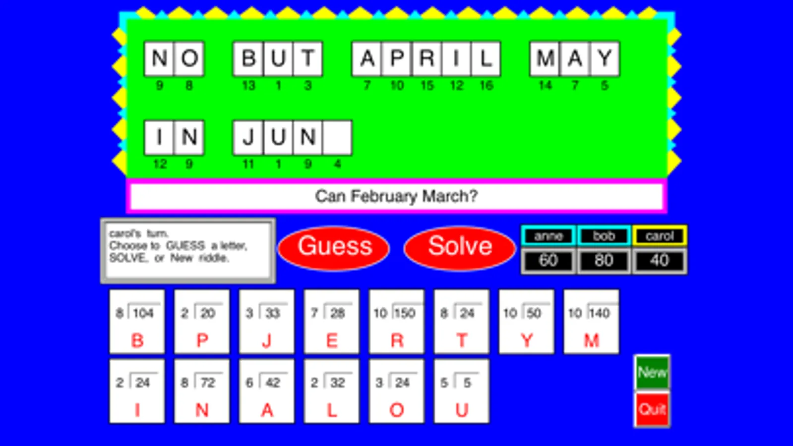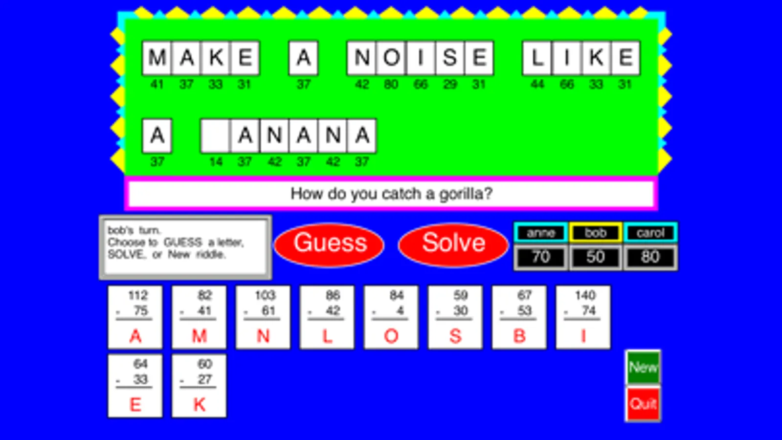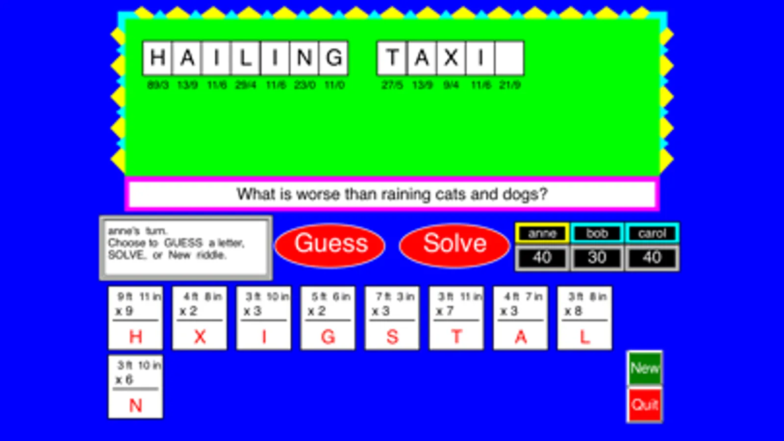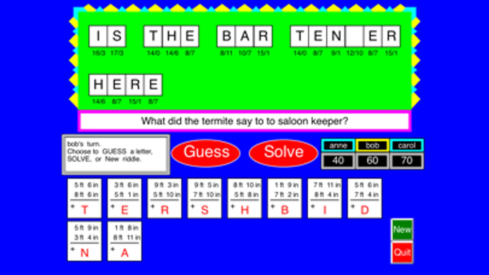 Math Galaxy Whole Number Riddles is a game like Wheel-of-Fortune, with the answers to math problems as clues to riddles and word jumbles. There are 500 riddles and 600 word jumbles with definitions which are chosen randomly. Numbers for math problems are created randomly and cover whole number operations (add, subtract, multiply, divide), time, money, and measurement (which includes adding, subtracting, multiplying and dividing length, volume/capacity, weight and time).