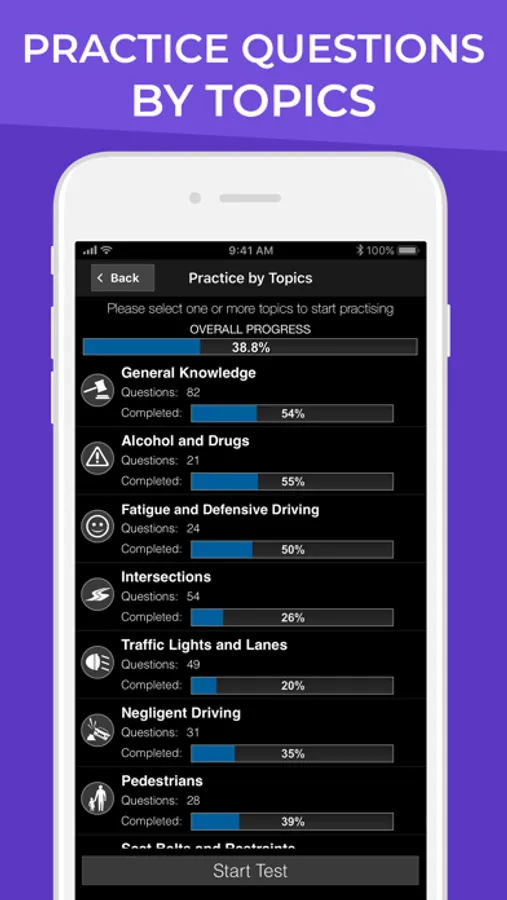 You can select one or more categories to practice. You can also perform rapid tests for 10, 20 or 30 questions.