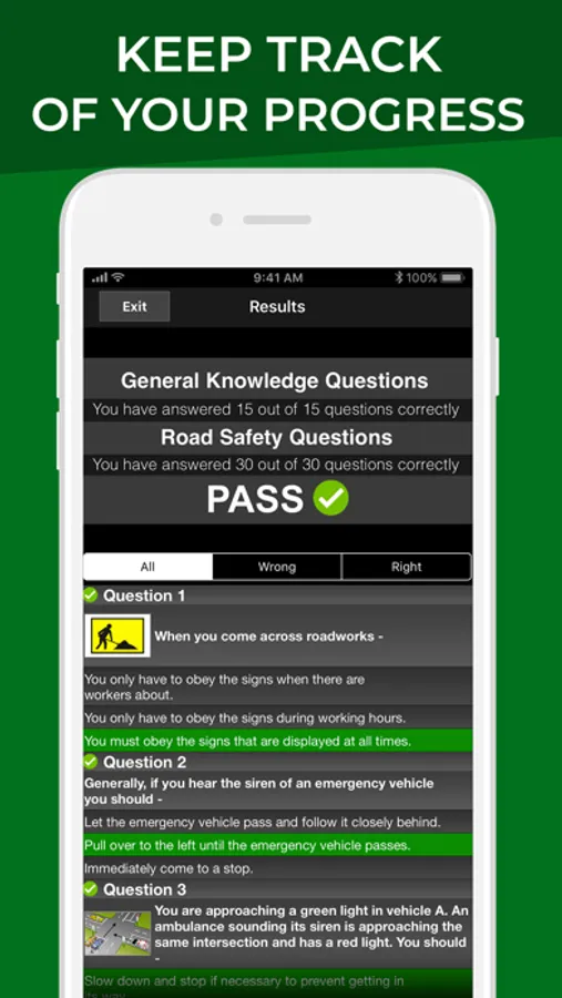 Perform a simulation under the same conditions as the official RTA test. To pass the exam learner are required to answer at least 12 DKT questions correctly among the 15 general knowledge questions and at least 29 correctly among the 30 road safety question.