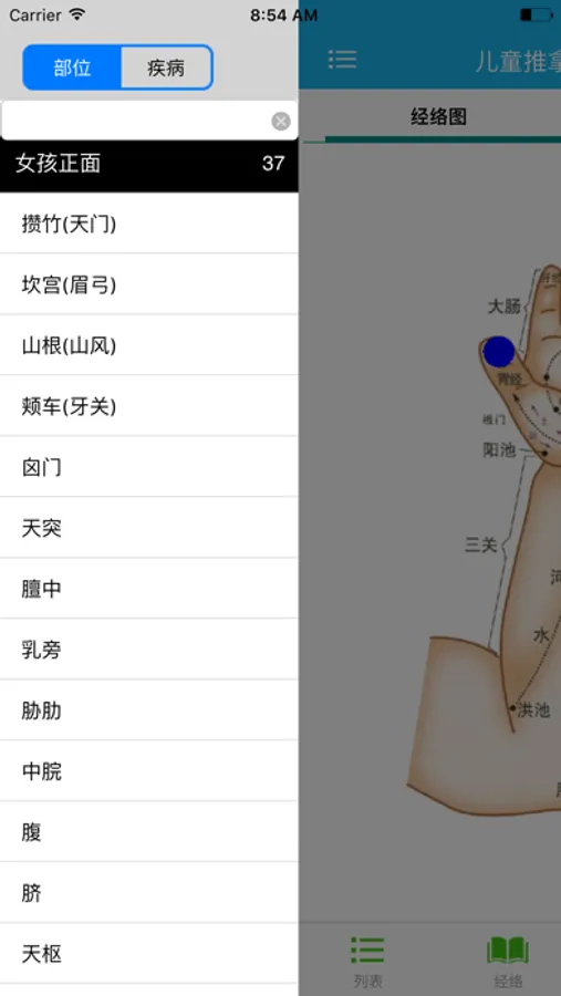 1、可以根据穴位的拼音或穴位的名字查找,显示所在区域及可治疗的疾病等相关信息;