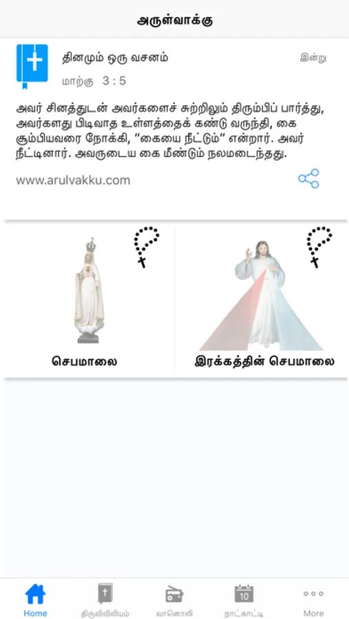 Arulvakku.com provides various e-services for the Catholic faithful: Official Release of Tamil Catholic Bible online, Daily Readings, Reflections on Daily Reading, Internet Radio, Rosary, Daily Liturgical Calendar, Buying Religious Articles....