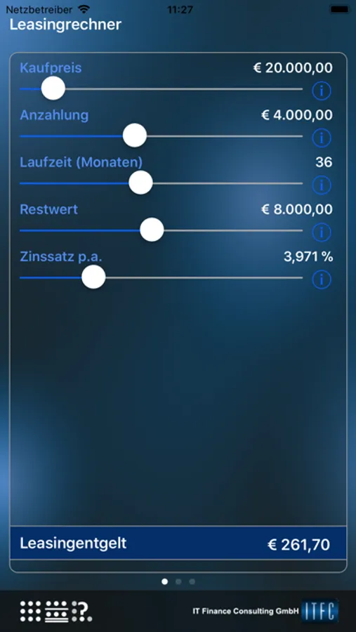 Leasing1x1 bietet Ihnen einen umfangreichen Kalkulator, mit dem Sie schnell und unkompliziert die monatlichen Kosten, den Effektiv- und Sollzinssatz sowie die Gesamtbelastung einer Leasingfinanzierung berechnen können.