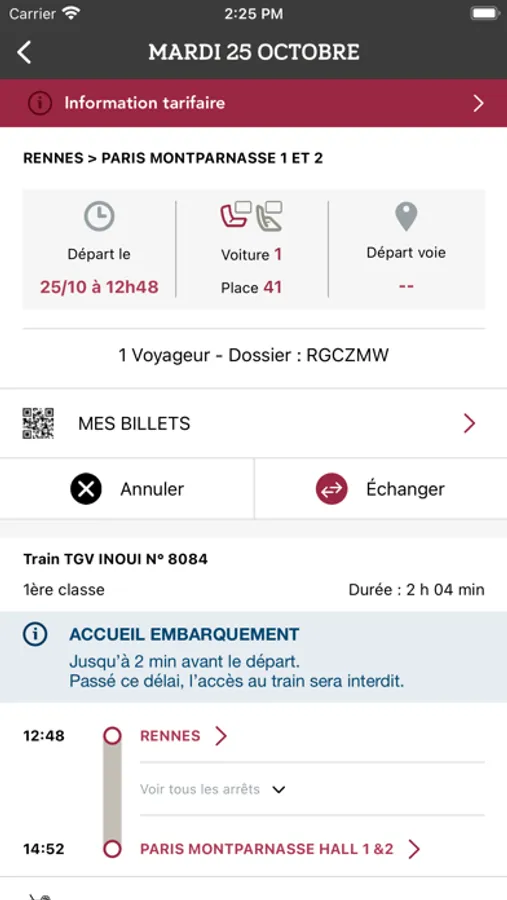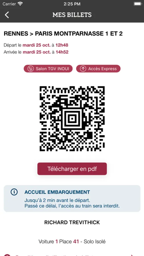 Vos e-billets loisir* pour consultation uniquement (les tarifs loisir sont non échangeables et non annulables sur l’appli TGV INOUI PRO)