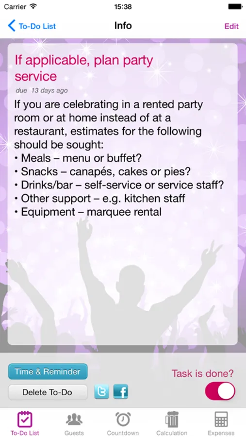Based on the date you determine for the party the system will compute your personal party countdown and help you to accomplish the necessary tasks in time. To this end the app will remind you even a month before the event of the first open tasks. Of course you can also change this timeframe as needed. A preconfigured task list ensures that during the organization of the event nothing will be overlooked, and moreover can be manually tailored to your personal requirements in creating the event. Via push notification you will be conveniently reminded of tasks yet outstanding. That facilitates planning your event and ensures that no details will be forgotten.