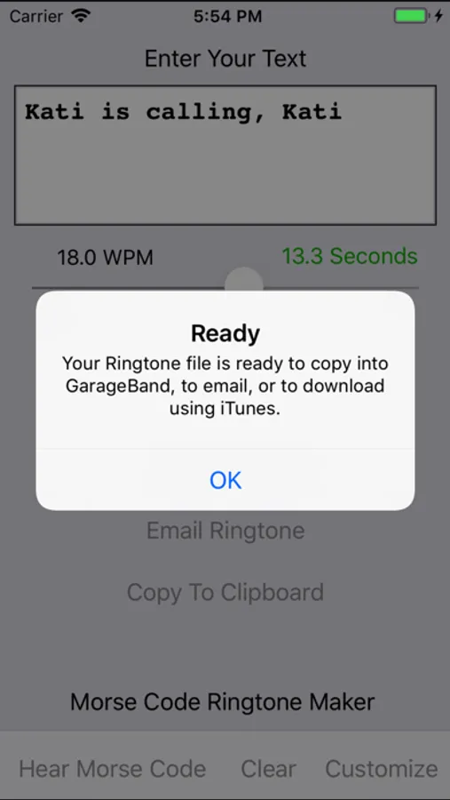 This app allows pasting your new Morse Code ringtone sound directly into an iOS GarageBand track, thus allowing one to create a ringtone directly on a iOS device, without having to Sync with iTunes. (Note that using GarageBand on iOS to install a ringtone is not a simple one-step process. GarageBand requires a user to navigate and find several obscure looking buttons over multiple steps in order to create and install a new ringtone.)