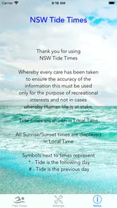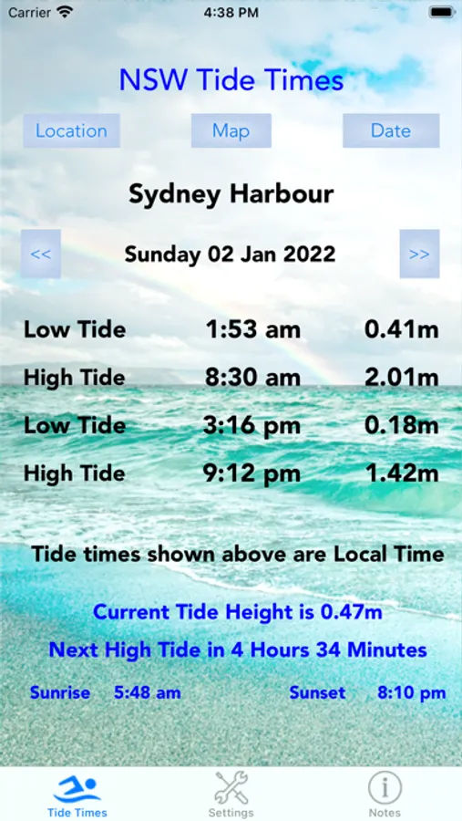Sydney and NSW are wonderful places to live or holiday. With this application you can track the tidal information for the area as it shows all the low tide, high tide, sunrise and sunset times, for that current day. The tide heights are also displayed, along the actual current tide height for that location. There is a display of the next tide due and how long. You can also select future dates, to make it easier to plan a successful beach, fishing or river trip. No Internet access is required, so even if you are sitting in an area with no coverage, you can still check the tide information. The GPS and maps function does require a data connection though. All coast locations in NSW are covered for Sydney beaches and surrounding NSW ports, including Batemans Bay, Byron Bay, Camden Haven, Cape Hawke Harbour, Clarence River, Coffs Harbour, Jervis Bay, Lake Illawarra, Lake Macquarie, Manning River, Port Kembla, Port Stephens, Shoalhaven River, Gladesville Bridge, Spit Bridge, The Entrance, Wollongong, Wooli River and more.......