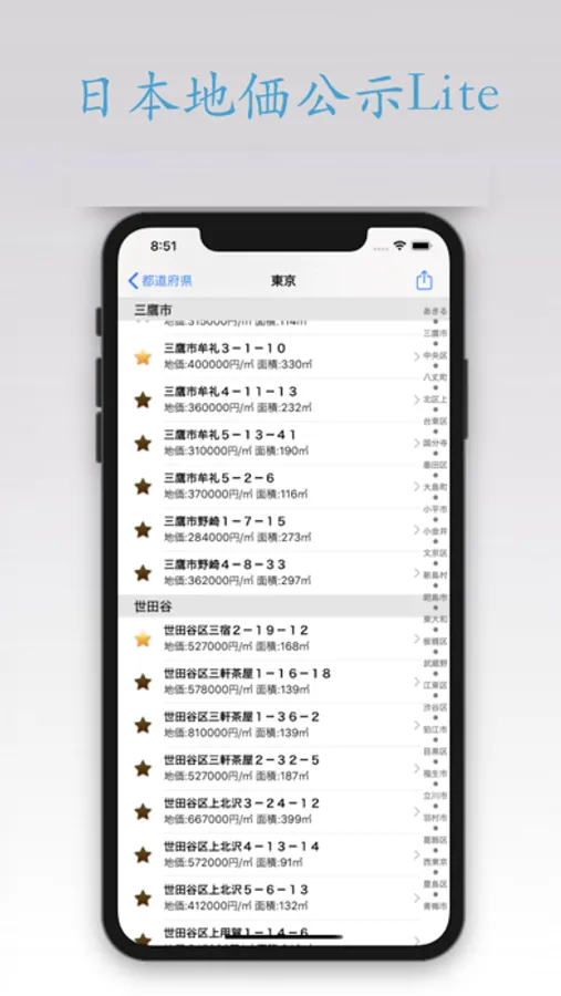 *「都道府県」内のすべて或は指定した「市区町村」の地価情報を切り替え表示できる。