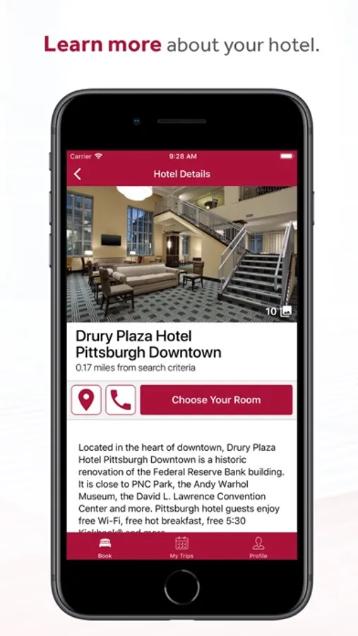 Book your next stay with the free Drury Hotels iPhone app. Our official Drury Hotels app makes it easy to make your reservations at any of our 150 hotels throughout 25 states - anytime, anywhere!