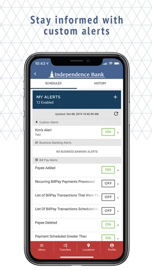 In order to take advantage of our seamless banking services, you must be enrolled in Digital Banking and have an Independence Bank checking or savings account. If you are not currently enrolled, please call or visit your nearest Independence Bank location or our website www.1776bank.com to learn more. Once enrolled, download the app to begin managing your finances anytime, anywhere from any mobile device.