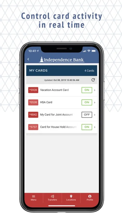 Manage all Independence Bank debit cards issued to you through one simple platform. Easily toggle your card on and off in real time and control card functionality without disrupting recurring transactions.