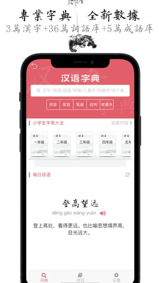 包含所有汉字笔顺动画的真人发音词典。是目前市场上数据新、汉字齐全、百万词库,功能强、搜索快的汉语字典(拼音、笔画、部首、结构、笔顺都包含)、汉语词典、成语词典、汉英词典、双语例句、古诗词大全、文言文大全、中小学语文学习好助手,所有内容及功能下载数据包以后即可离线使用。