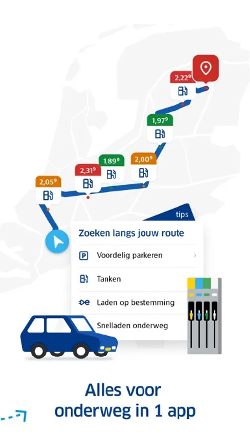 Plan een route en bekijk voor je in de onderweg gaat waar je kunt tanken, laden of parkeren op jouw route of bestemming. Bekijk waar je het best en goedkoop kunt parkeren en stel deze parkeerplaats direct in als eindbestemming. Wil je onderweg tanken? De app toont alle tankstations inclusief prijzen op of langs jouw route. Voeg eenvoudig het tankstation naar keuze toe aan de route. De appt geeft aan hoeveel extra reistijd er eventueel is. Als je elektrisch rijdt, filter je op laadpalen. De app toont alle laadpalen op jouw route of eindbestemming. Met één klik voeg je een laadpaal toe aan de route. In Europa tonen we ook tolkosten. Zoals je van de ANWB gewend bent, krijg je alle actuele files en verkeersinformatie.