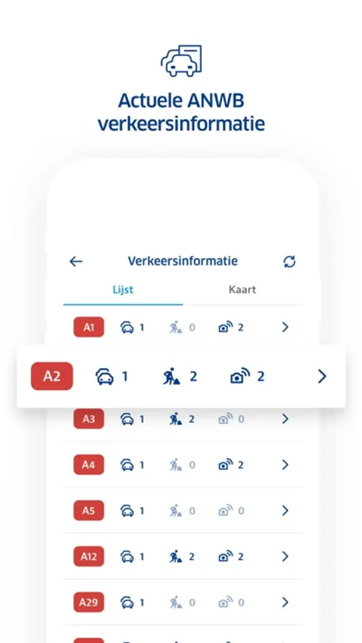 In de app vind je een overzicht van actuele en betrouwbare ANWB verkeersinformatie in de buurt of op je route, zoals files (alle wegen), flitsers (snelwegen) en wegwerkzaamheden. Met de handige verkeersinformatielijst kun je per wegnummer alle files en incidenten bekijken.