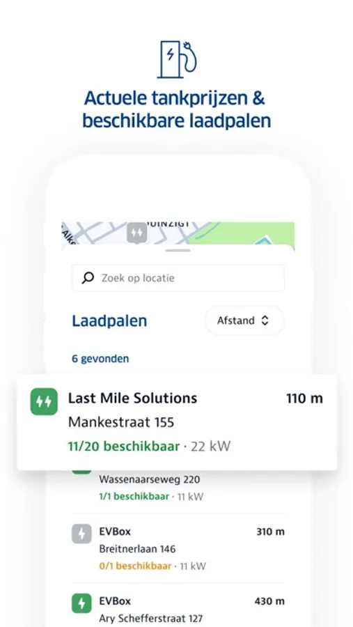 Ook alle openbare laadpalen vind je via de navigatie tab. Je kunt kiezen voor laden onderweg zodat de app alle snelladers op jouw route toont of je kiest voor laden op bestemming en ziet daarmee alle laadpalen rondom jouw eindbestemming. Met het aantal elektriciteit iconen geven we een indicatie van de laadsnelheid en de kleur geeft de beschikbaarheid aan.