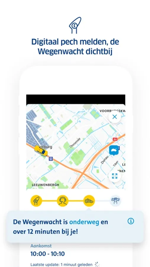 Geef je pech makkelijk door aan de Wegenwacht via de ANWB Onderweg app. In Nederland en het buitenland. Via de app kun je alle benodigde informatie zoals je exacte locatie doorgeven. Zo helpt de Wegenwacht je snel weer op weg. Na de pechmelding ontvang je een sms met een link waarmee je kunt volgen wat de status van je Wegenwacht is.