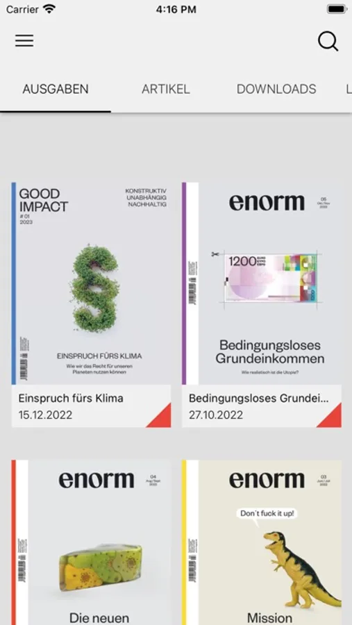 Als Abonnent oder Inhaber des Digitalabos erhältst Du automatisch Zugriff auf alle enorm Ausgaben über unsere App. So hast Du immer dabei, was wichtig wird: Artikel, Trends, Jobs mit Sinn, Events und vieles mehr. Nicht-Abonnenten können einzelne digitale Ausgaben für jeweils 6,99 Euro beziehen. Zum Lesen und Verwalten Deiner digitalen enorm Ausgaben stellen wir die kostenlose enorm App zur Verfügung.