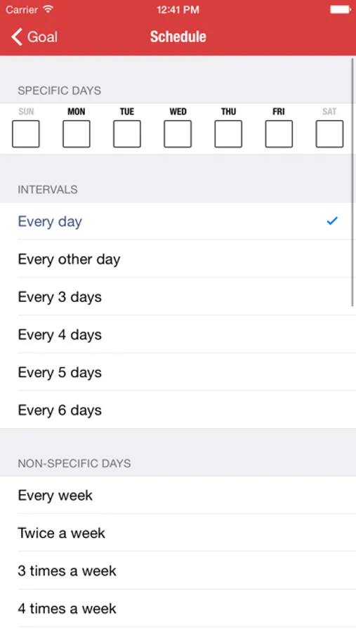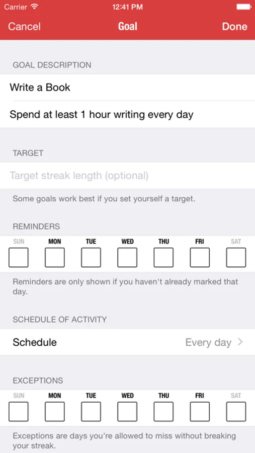 Once you've defined your goal, you use Goal Streaks to track the days you work on it. Build up a "streak" by hitting the schedule you define and then try to make the streak as long as possible. Use the daily notification to remind yourself to stay on track.