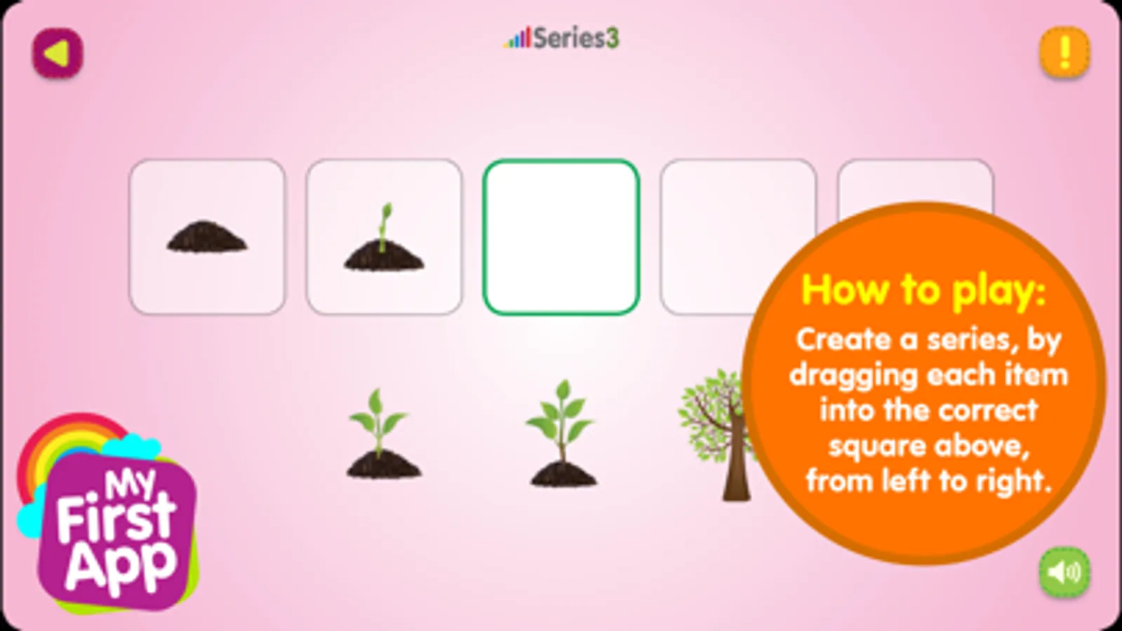 HOW TO PLAY: The game consists of several boards. Each board contains 5 items that are all part of a series randomly placed in a row. The aim of the game is to create a series, by dragging each item into the correct square above, from left to right.