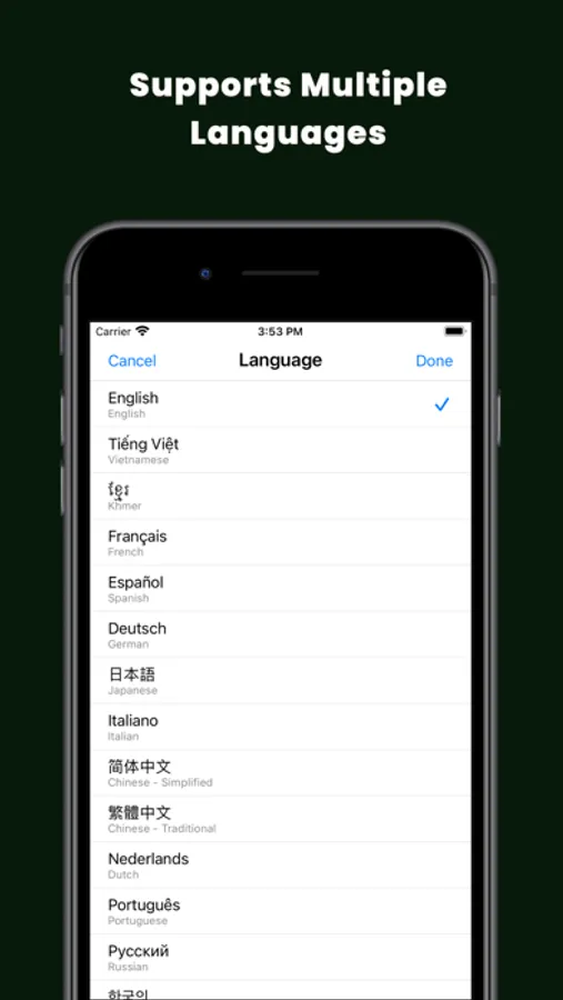 You can choose your preferred language from English, Vietnamese, Khmer, French, Spanish, German, Japanese, Italian, Chinese(Simplified), Chinese(Traditional), Dutch, Portuguese, Russian, Korean, Swedish, Norwegian, Arabic, Polish, Danish, Turkish, Hebrew, Greek, Finnish, Vietnamese, Khmer, Hindi, Burmese, Thai, Indonesian, Sinhala, Filipino, Malay