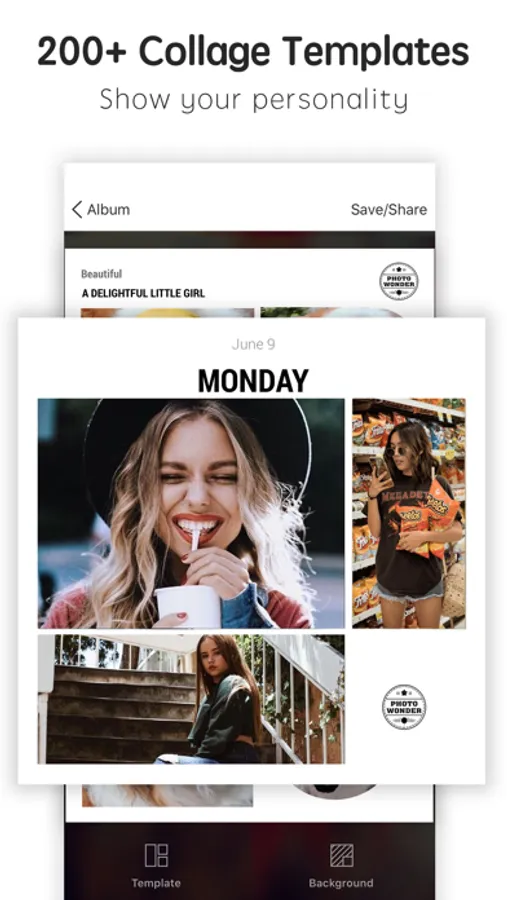 PhotoWonder provides 3 collaging modes: template collage, free collage and photo collage. The rich templates and fresh backgrounds help you create your own photo wall.