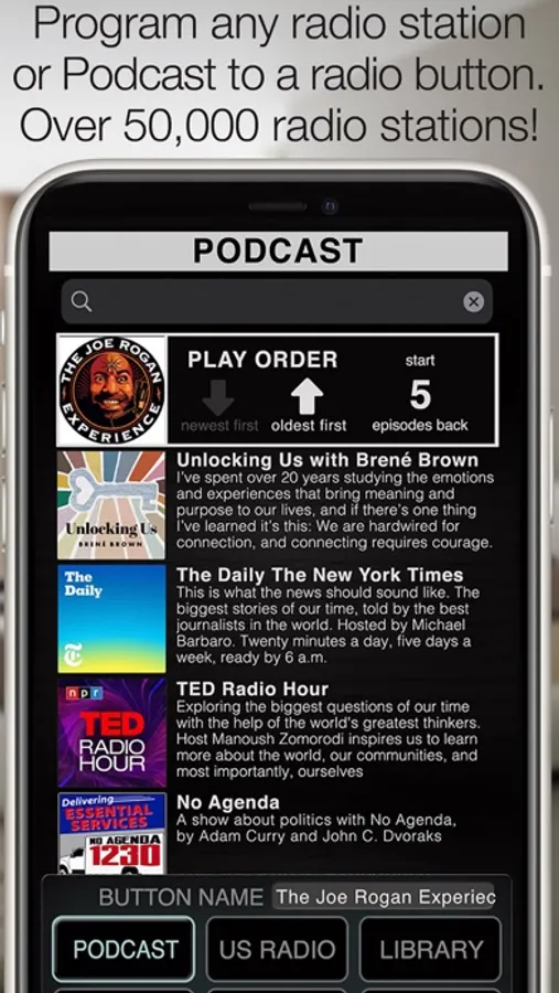 Press and hold the radio button to bring up the radio sources, Select a Podcast and scroll through the top 100 or use the search bar to search for your favorite podcast. After saving to the radio button, play the podcast and touch the info bar below the radio buttons to bring up the episode list, here you can select the play order and mark podcasts as played or unplayed so they can be skipped or played again. Use the arrows on the top to set the order in which the episodes are played.