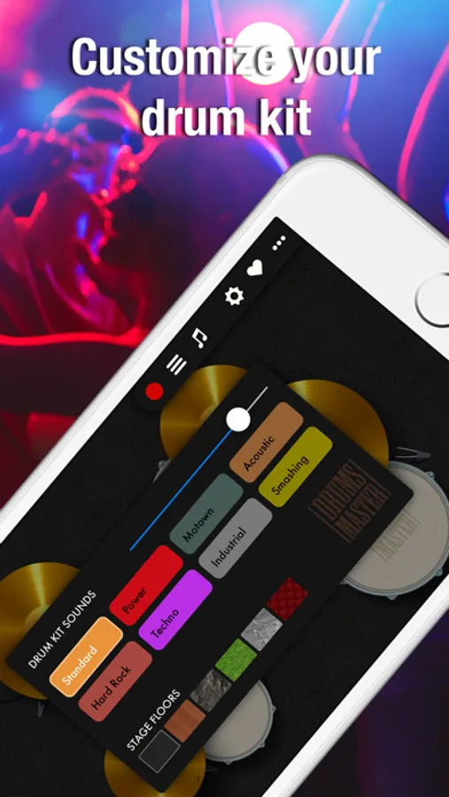 • Customize your drum kit with different sounds and stage floors