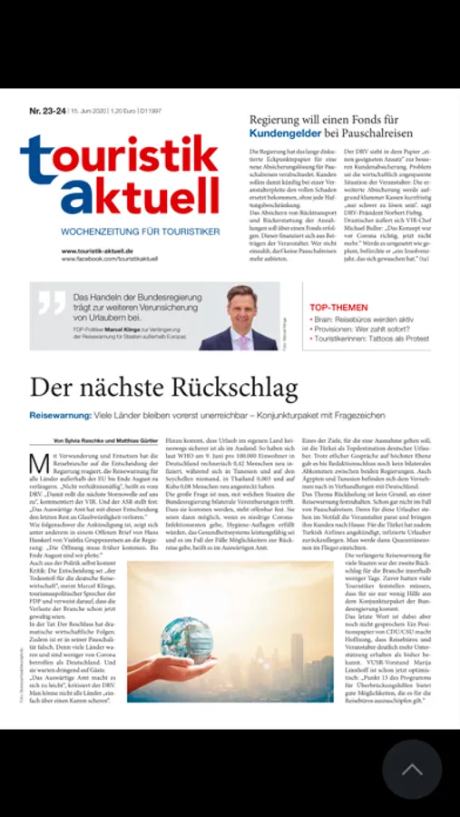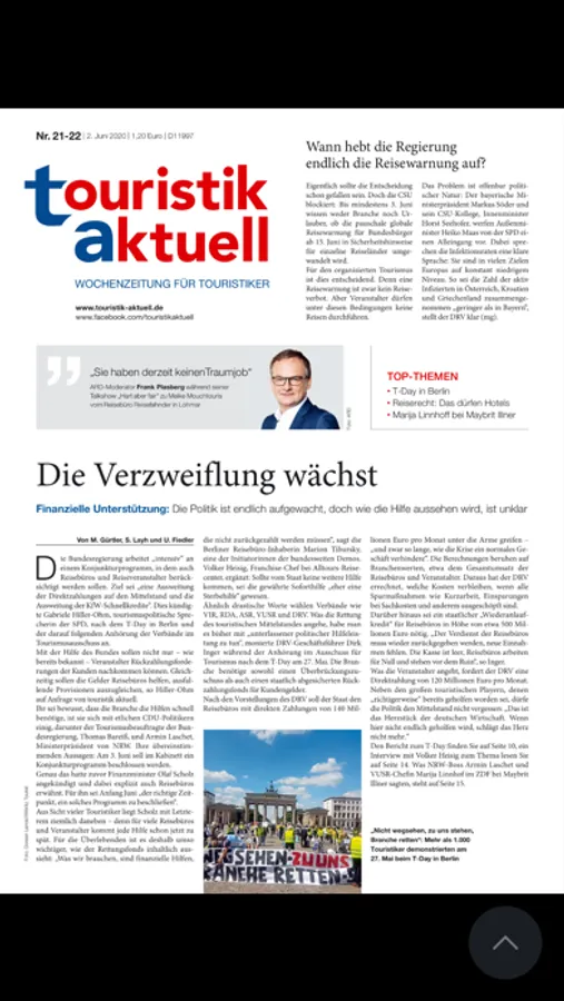 Dabei bringt touristik aktuell die wichtigsten Informationen auf den Punkt – ohne jedoch an der Oberfläche zu bleiben. Reportagen, Analysen und Schwerpunkte gehen in die Tiefe und bieten Einblick in Hintergründe. Praxistipps für das Tagesgeschäft und Kommentare runden das Angebot ab.