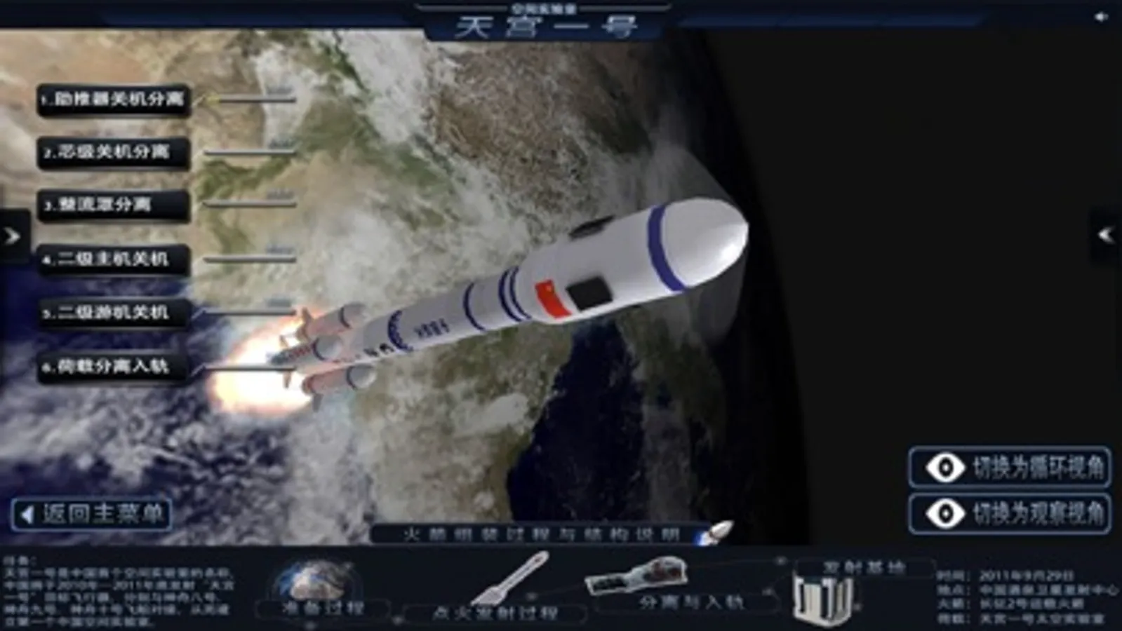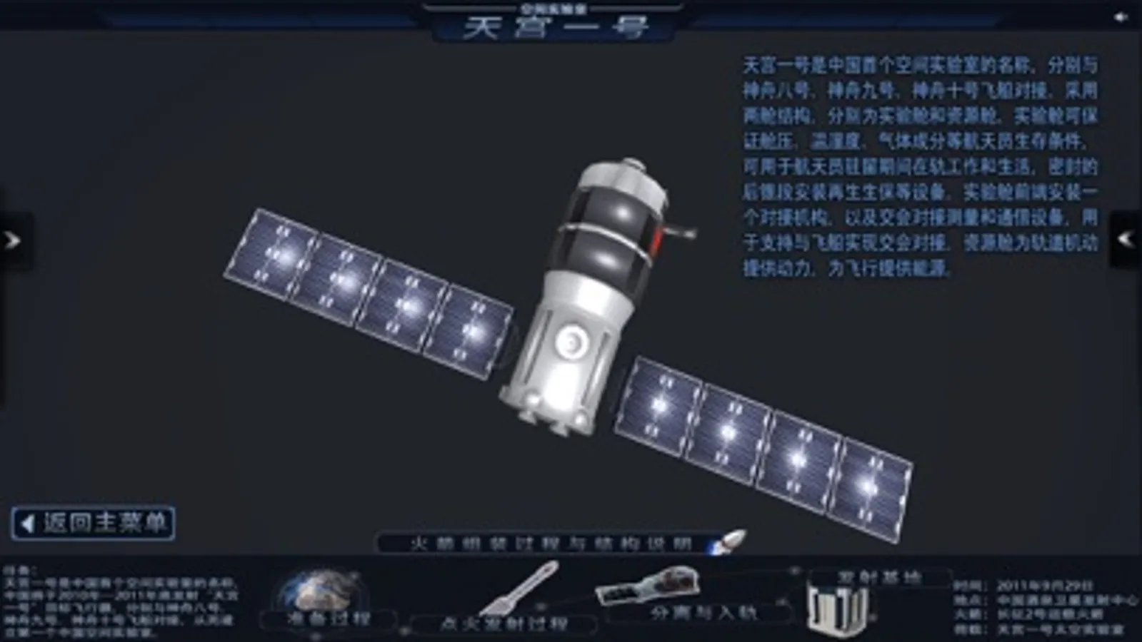 天宫一号(英文名称:Tiangong-1)是中国第一个目标飞行器,于2011年9月29日21时16分3秒在酒泉卫星发射中心发射,飞行器全长10.4米,最大直径3.35米,由实验舱和资源舱构成。它的发射标志着中国迈入中国航天“三步走”战略的第二步第二阶段。2011年11月3日凌晨顺利实现与神州八号飞船的对接任务。按照计划,神舟九号、神舟十号飞船将在接下来的时间里依次与天宫一号完成无人或有人交会对接任务,并建立中国首个空间实验室。