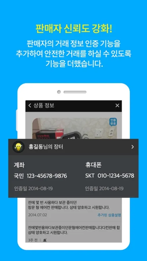 - 판매자의 휴대폰과 은행 계좌번호 인증 시스템을 도입하여, 중고 상품 구매시 매우 중요한 판매자 신뢰도 변별력을 제공합니다.