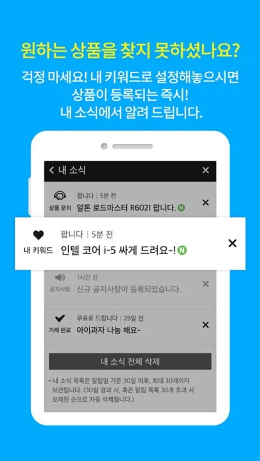 - 언제 어디서나 내가 설정한 키워드에 맞는 상품이 등록되면 바로바로 알려 드려요