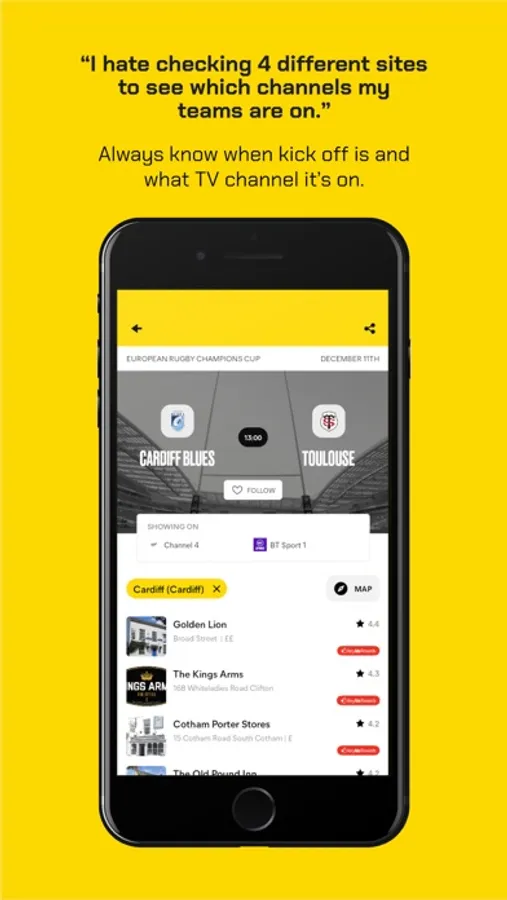 We’re the app for anyone who’s ever asked “Does anybody know a pub that will be showing…?”