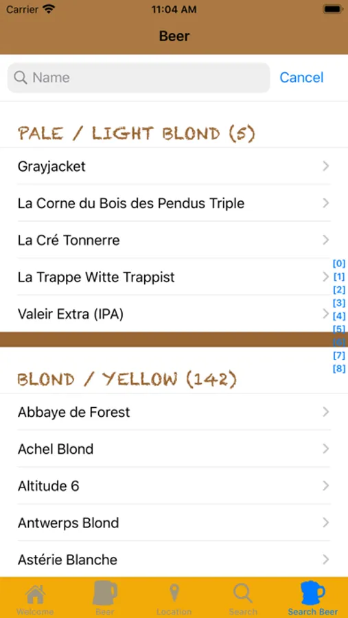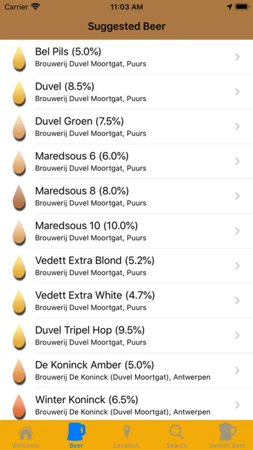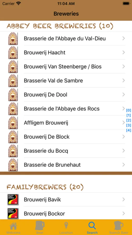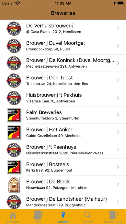 Find a brewery by using the city or village name as a search word (or start of the name like antw for antwerpen) in the Search tab or use the Location tab to find the breweries in order of distance to your current position.